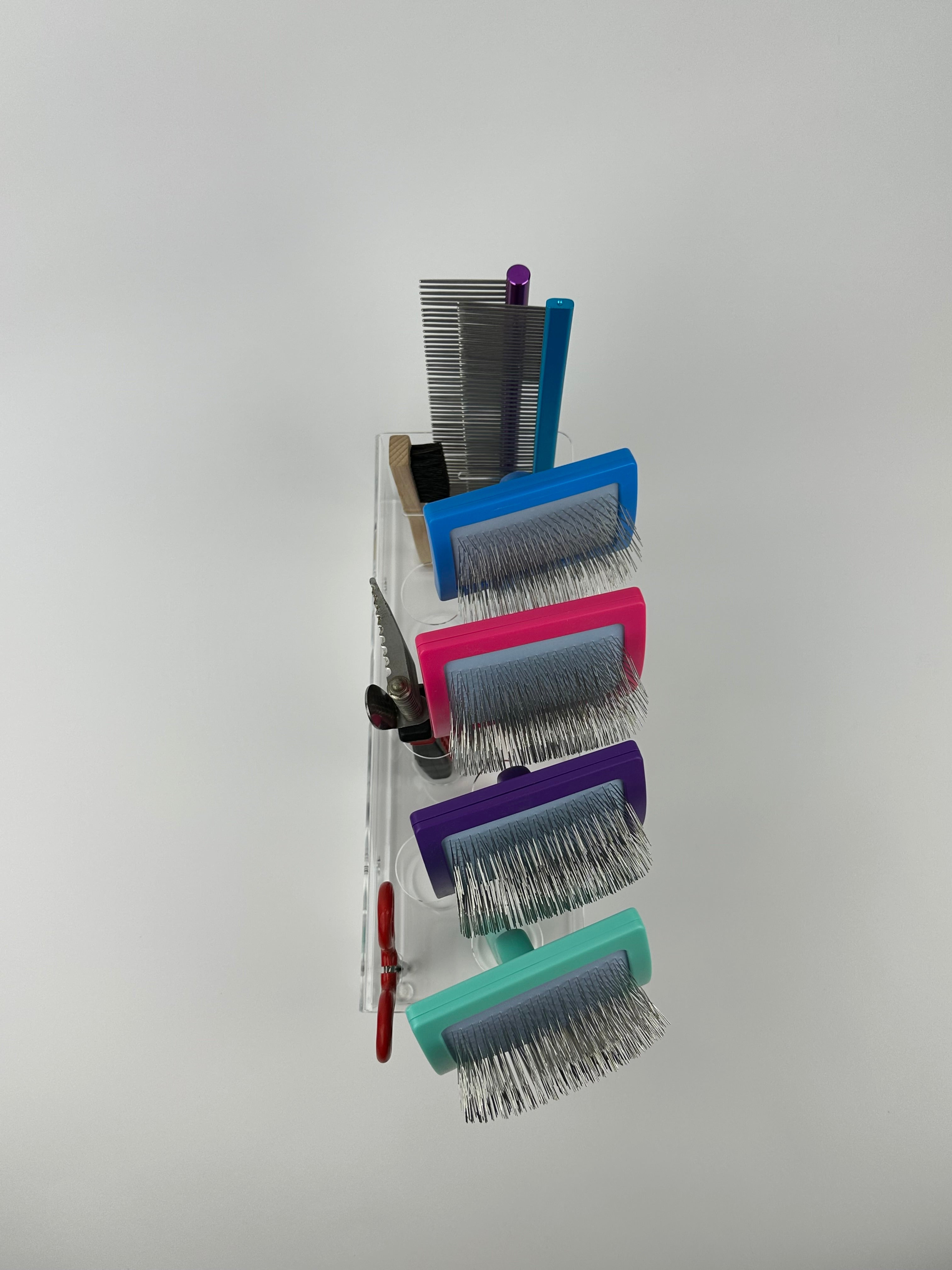 Brush and Comb Organizer Holder, designed to be installed on the Wall or placed on a Table Top. Perfect for Mobile Pet Groomers and salons as well, to maintain their work area clean and organized in a neat and unique way.